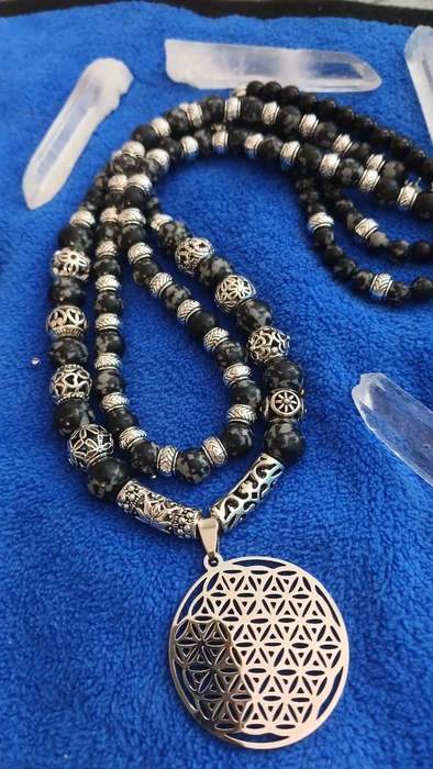 תליון פרח החיים וחרוזי אובסידיאן (שרשרת ארוכה)